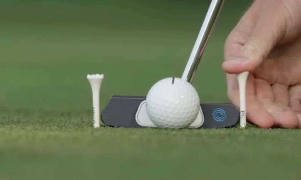 Blades demonstrates that the tees are basically resting against the putter so there is zero wiggle room. While this will result in you hitting the tees some of the time, it will calibrate you to what a perfect strike on the center of the putter face feels like because you have to have a perfect stroke in order to return the putter back to the ball at impact and not hit either tee.