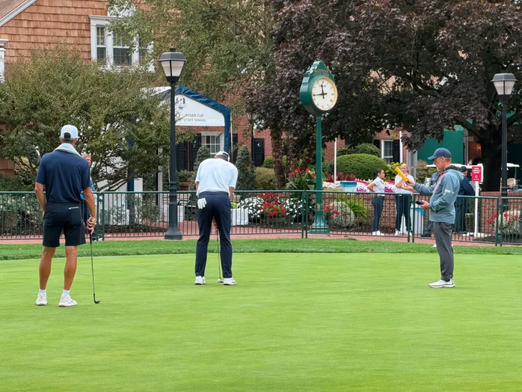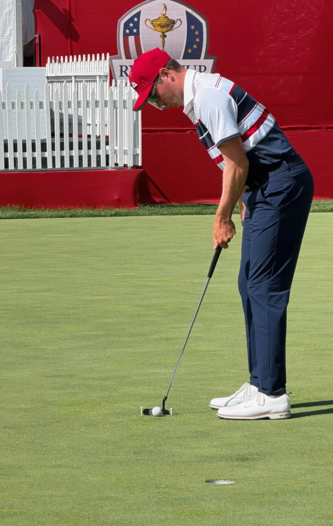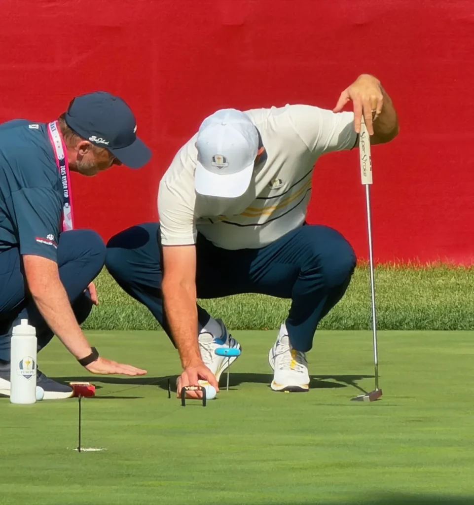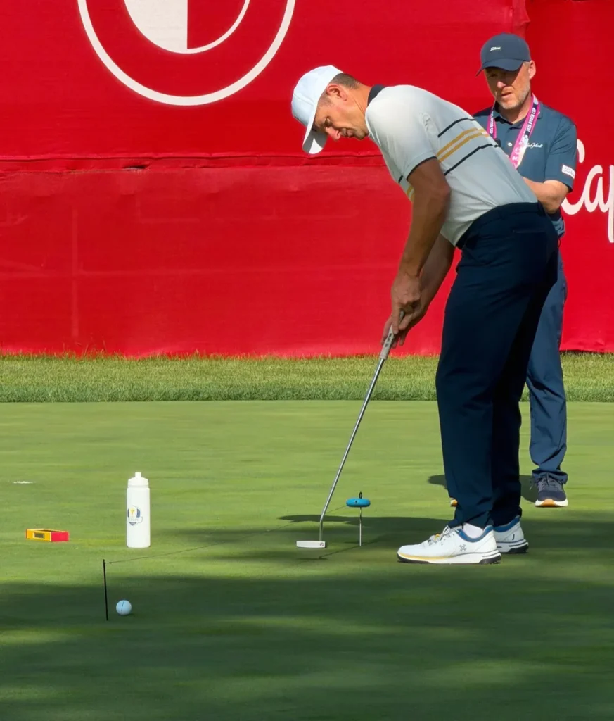 I’ve rounded up eight players I observed on the practice putting green at the Ryder Cup and detailed how they were practicing. While some of the techniques and putting training aids were more standard, like string lines, mirrors and putting gates, others were much more sophisticated and elaborate.