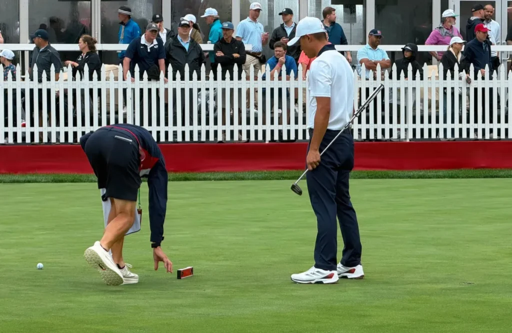 Collin Morikawa’s putting practice was one of the more scientific approaches and centered around calibrating his AimPoint. Morikawa straddled the line of a putt, feeling the amount of slope on the green with this feet. Morikawa’s caddie, Mark Urbanek, used a digital level to measure the actual degree of slope. Urbanek then paced the distance of the putt and calculated the amount of break in inches using the degree of slope and the distance of putt. Urbanek then used a tape measurer to measure that amount of break from the center of the hole, marking that distance outside the hole on the green with a chalk pen, which served as the aim point. Morikawa then went through his full routine and hit the putt.